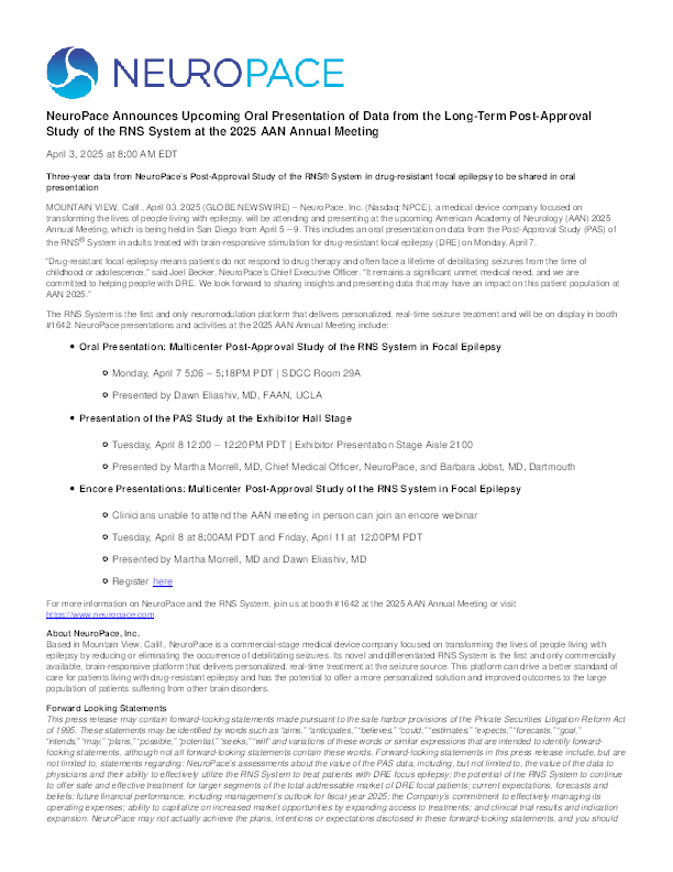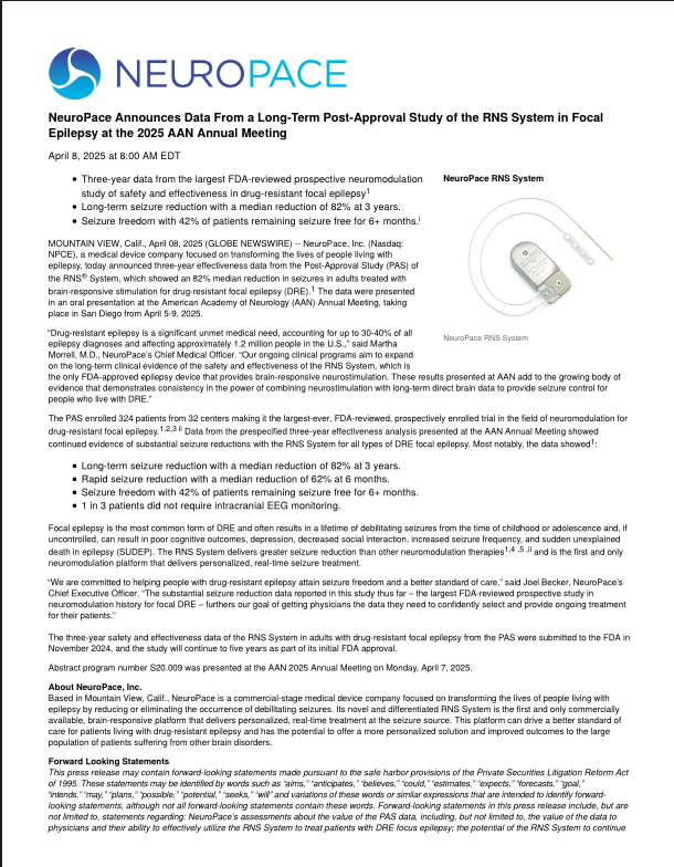 NeuroPace Announces Upcoming Oral Presentation of Data from the Long-Term Post-Approval Study (Press Release)