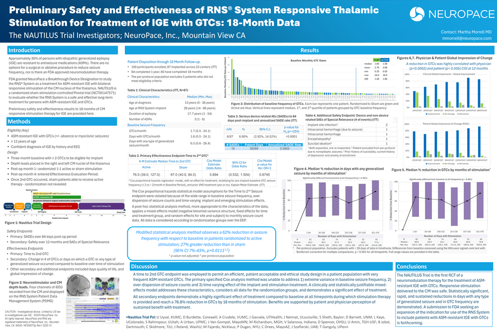 - Preliminary Safety and Effectiveness of RNS System Responsive Thalamic Stimulation for Treatment of IGE with GTCs: 18-Month Data, American Epilepsy Society, Dec 2025.